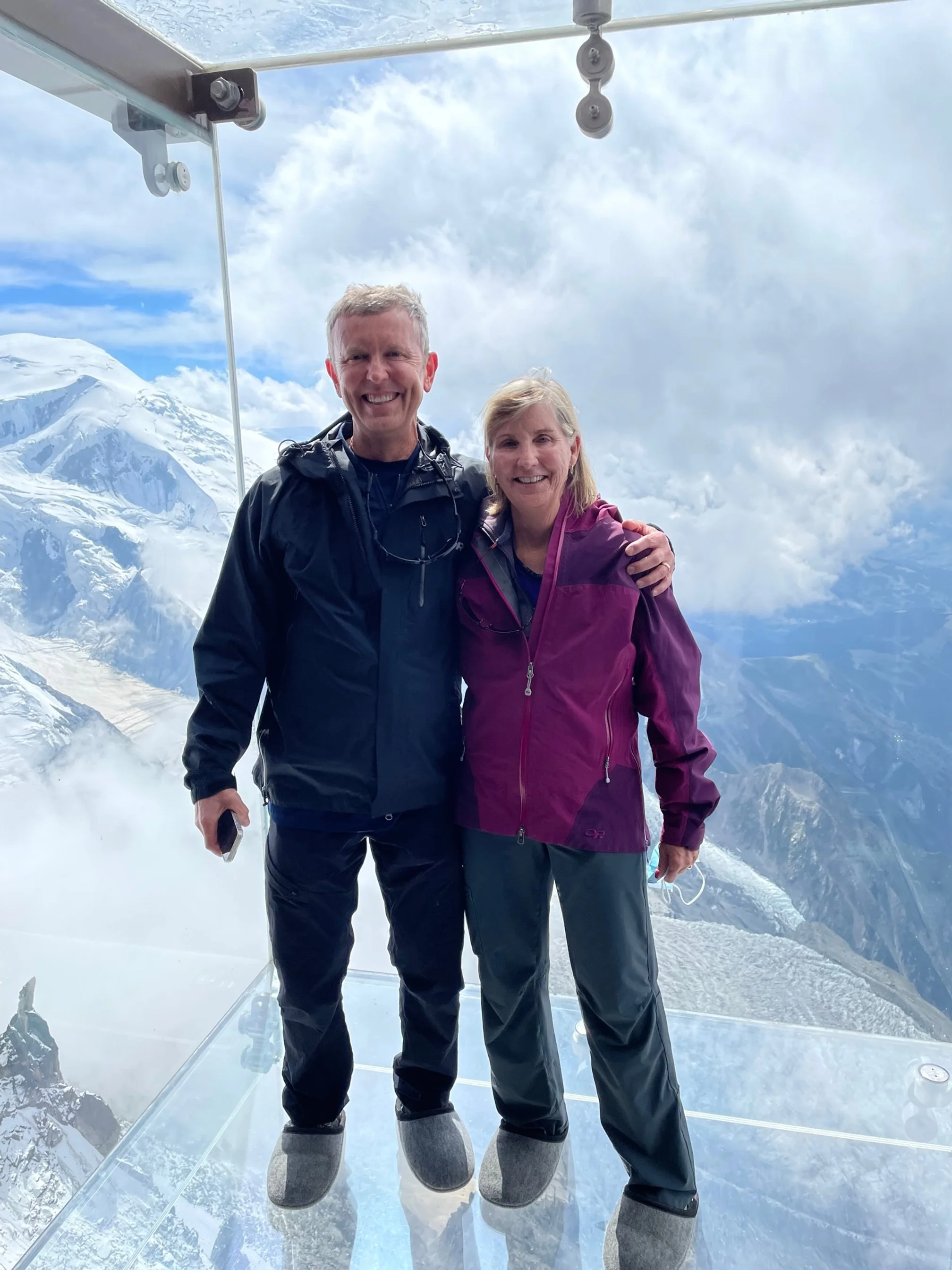 Here we are in a plexiglass box that sticks out the side of the Aiguille du Midi tram station. The fall is a couple of thousand feet down, so it can be quite concerning to stand in the box. That’s Mont Blanc in the background.